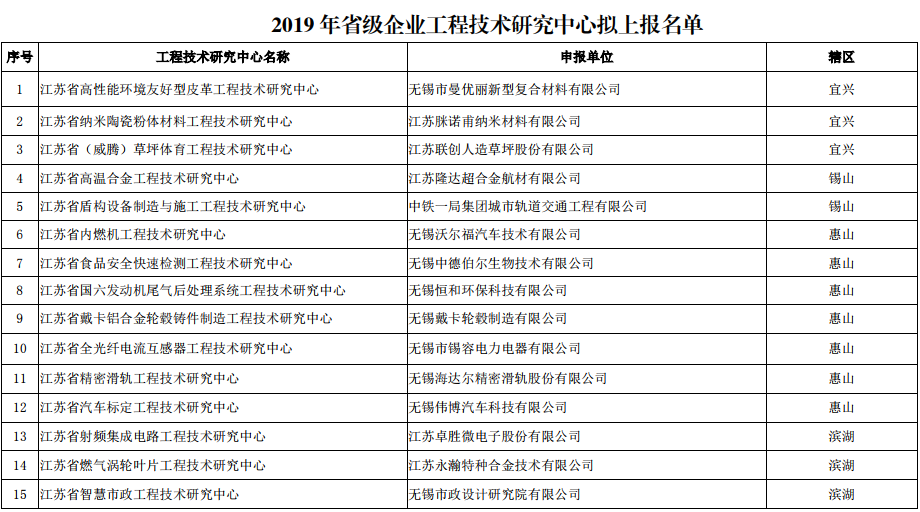 根據《關(guān)于做好2019年省級企業(yè)工程技術(shù)研究中心及省級企業(yè)院士工作站建設工作的通知》(蘇科研函〔2019〕264號)和《關(guān)于下放省級工程技術(shù)研究中心和省級企業(yè)人才站點(diǎn)管理權限的通知》(蘇科條發(fā)〔2015〕136號)的要求,受省科技廳委托,科技局對申報2019年省級企業(yè)工程技術(shù)研究中心的項目進(jìn)行了評審?,F將擬上報結果進(jìn)行公示,公示時(shí)間5個(gè)工作日(自2019年8月26日至8月30日)。 任何單位和個(gè)人如對公示項目有異議,可在公示期內以書(shū)面形式提出,并列舉異議理由和相關(guān)證明材料。以單位名義提出的,需加蓋單位公章;以個(gè)人名義提出的,需寫(xiě)明自己的真實(shí)姓名、單位、職務(wù)職稱(chēng)、聯(lián)系地址及電話(huà)等。 監督電話(huà):81821912 咨詢(xún)電話(huà):81821907?![]()